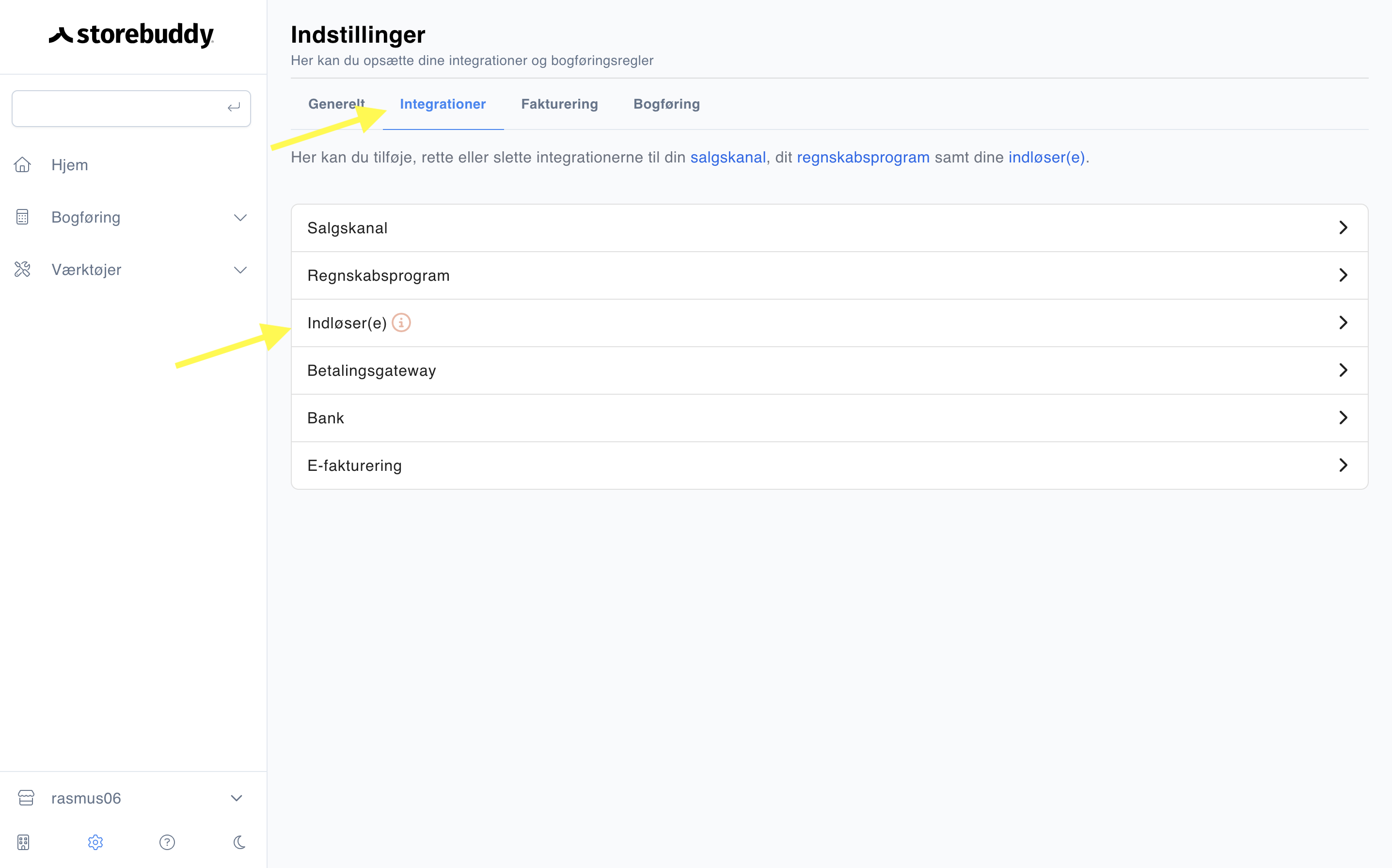 Tryk på 'Integrationer' i toppen i menuvælgeren og vælg 'Indløser(e)'