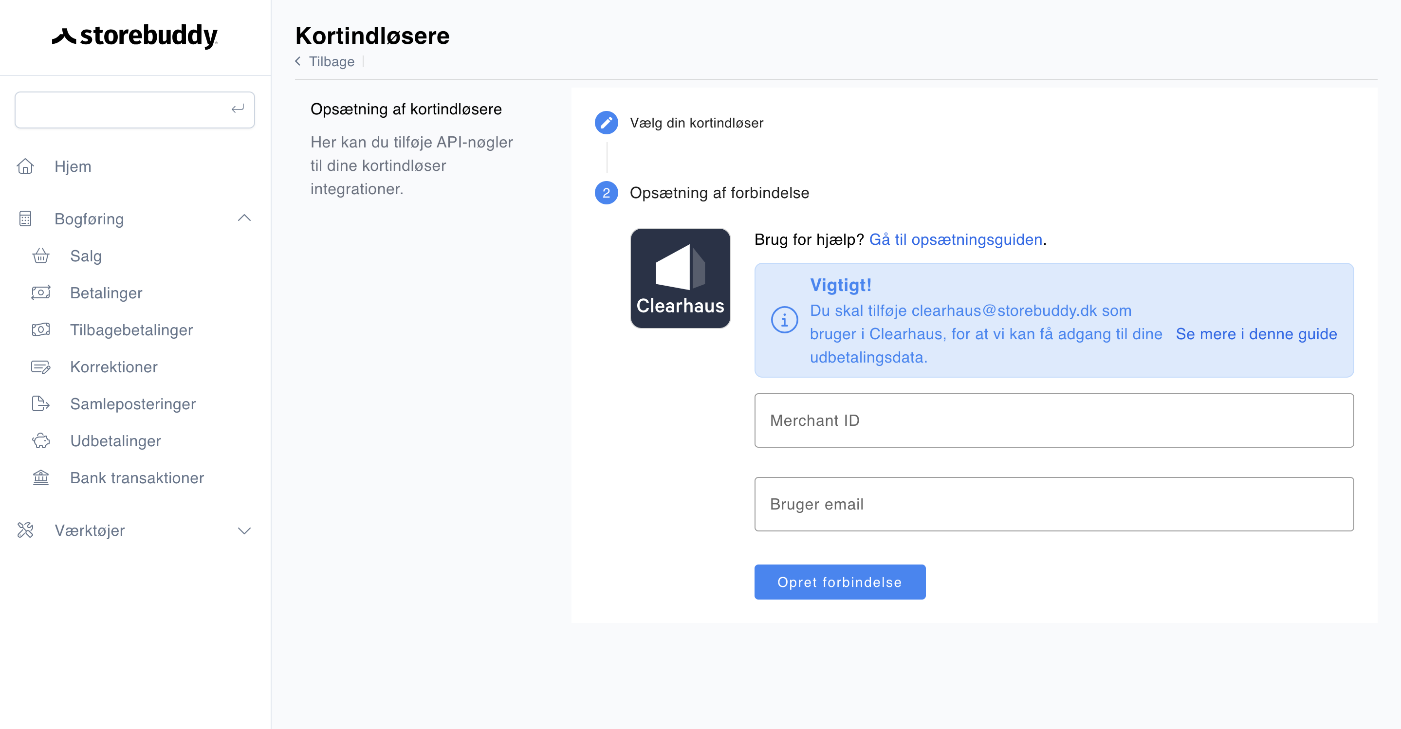 Nu er din Clearhaus konto klar til at kommunikere med Storebuddy. For at tilføje Clearhaus som indløser i Storebuddy skal du følge nedenstående steps;
