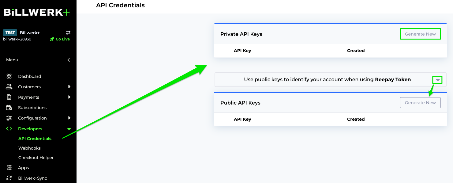 Du får API-nøglen ved at logge på din Reepay administration og gå til Developers -> API credentials.