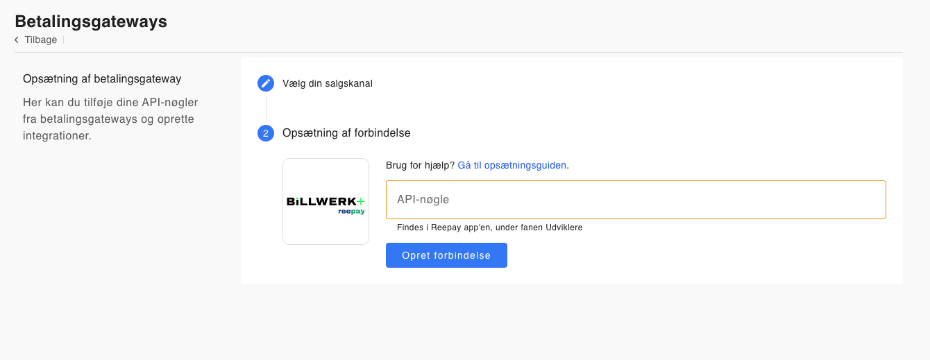 Vælg 'Billwerk/Reepay' og indsæt nøglen du lige har kopieret og tryk på 'Opret forbindelse'