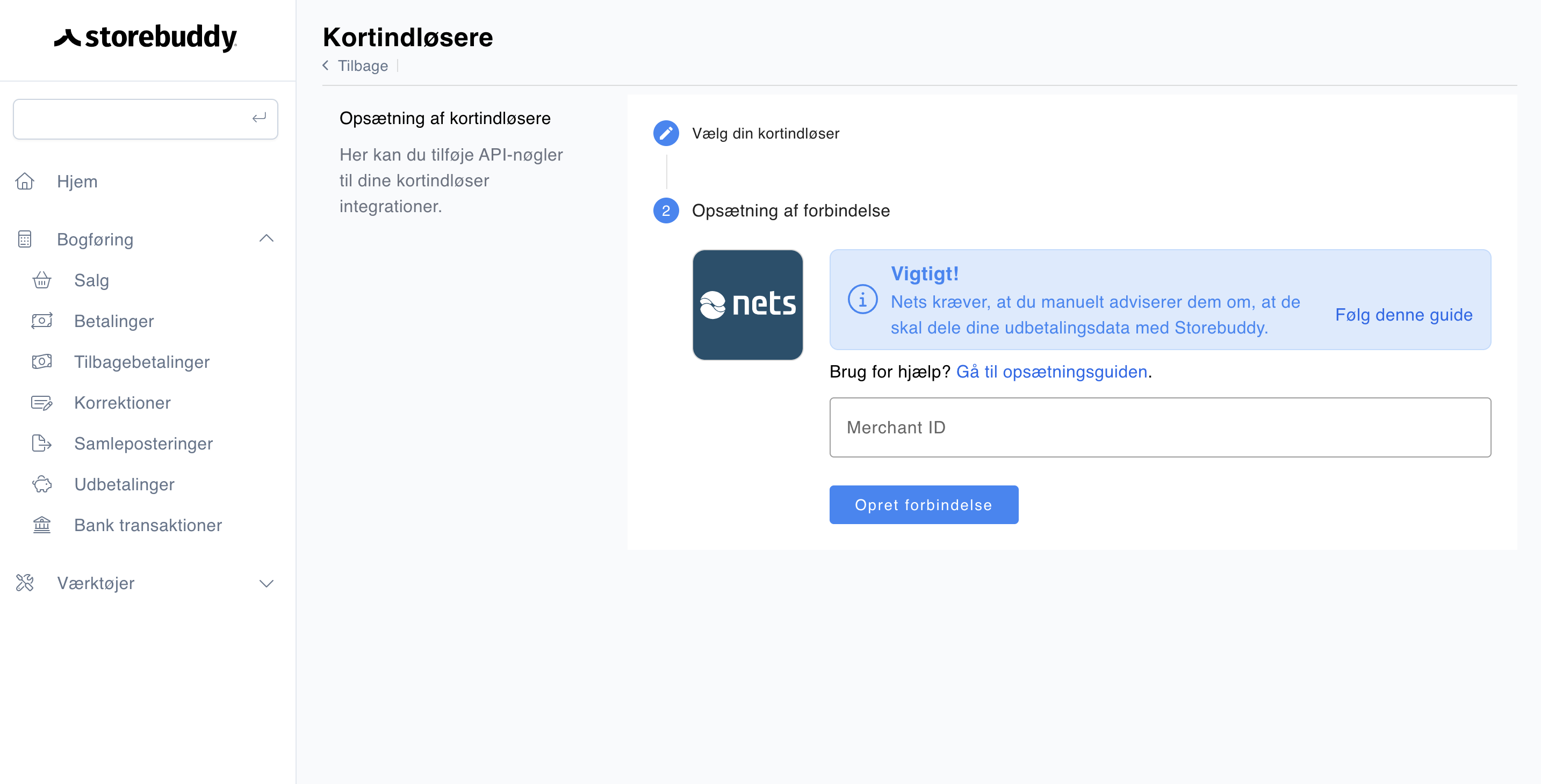 Du tilføjer Nets-integrationen i Storebuddy ved at følge de nedenstående steps;