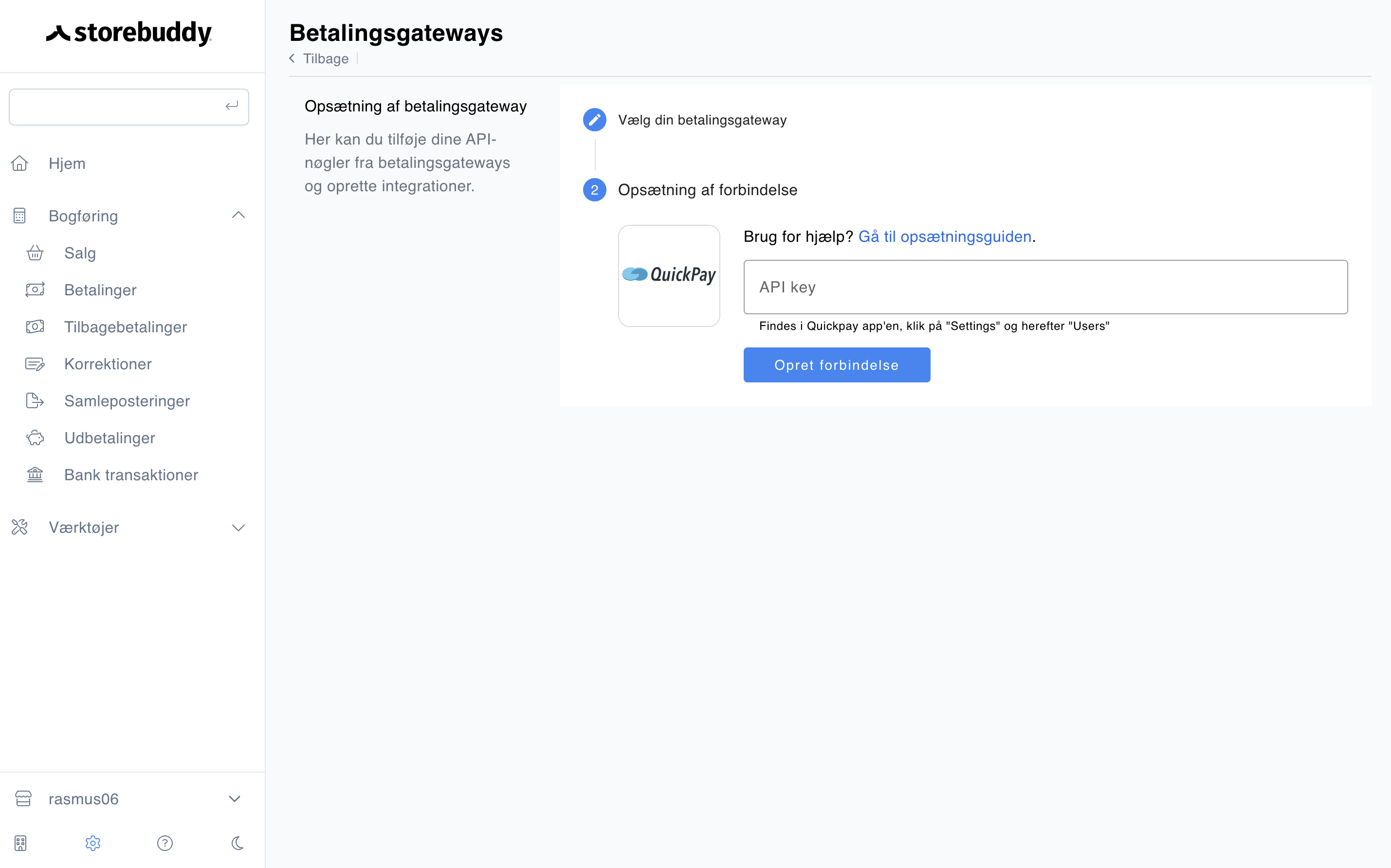 For at integrerer Quickpay med Storebuddy skal du først oprettet en API-nøgle i Quickpay, og derefter indsætte den i Storebuddy.