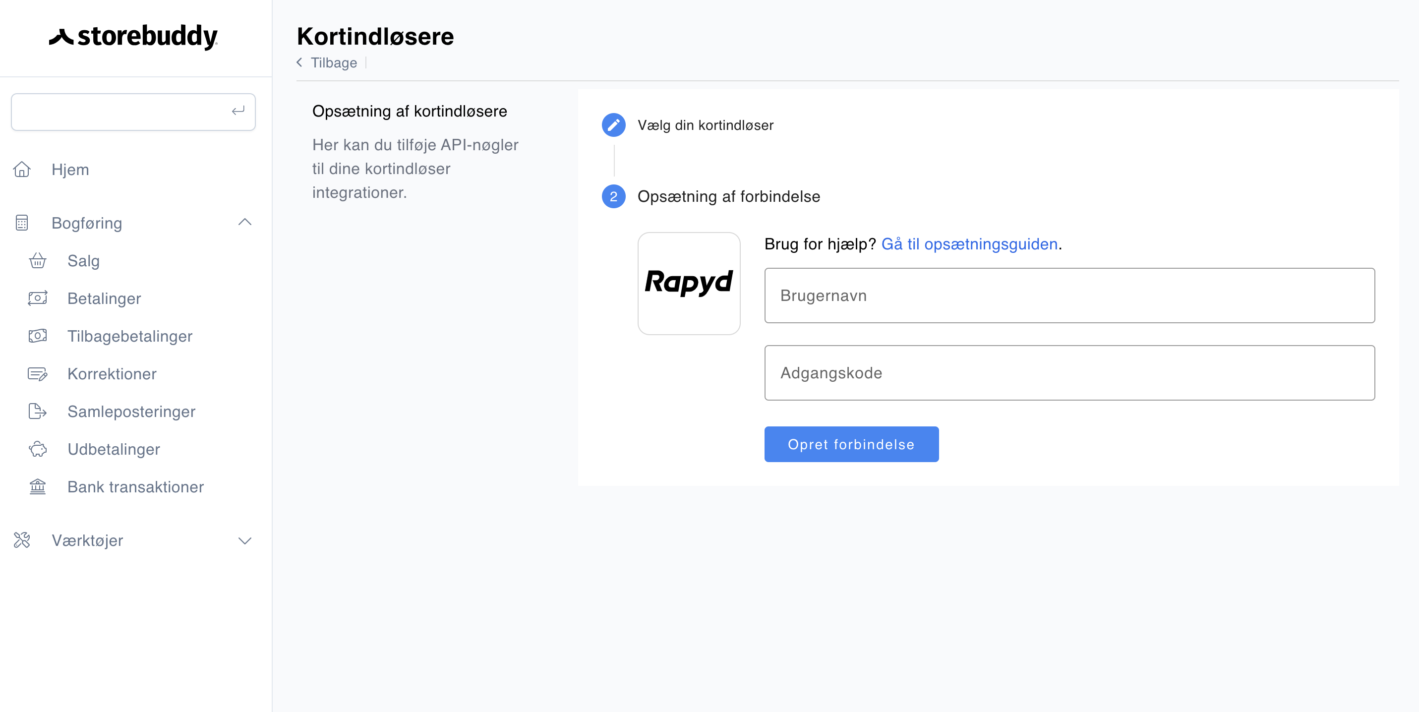 Når du har modtaget infoen fra betalingsudbyderen skal du logge ind i Storebuddy og følge nedenstående steps;