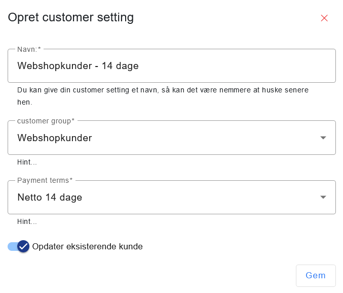 Customer group: Vælg hvilke kundegruppe som kunden skal oprettes i hvis der er tale om en ny kunder